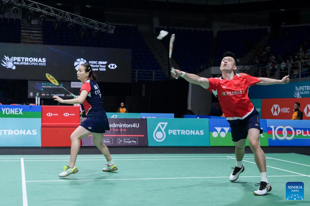 China's Wang Yilyu/Huang Dongping (L) compete during the mixed doubles round of 16 match against South Korea's Kim Won Ho/Jeong Na Eun at Malaysia Open 2023 in Kuala Lumpur, Malaysia, Jan. 12, 2023. (Photo by Chong Voon Chung/Xinhua)