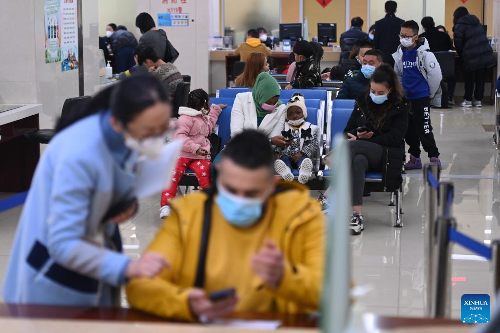Foreign merchants deal with affairs at the exit-entry administration of the public security bureau in Yiwu, east China's Zhejiang Province, Jan. 11, 2023. According to data from the local exit-entry administration, there have been over 10,000 resident foreign merchants in Yiwu up to now. (Xinhua/Huang Zongzhi)