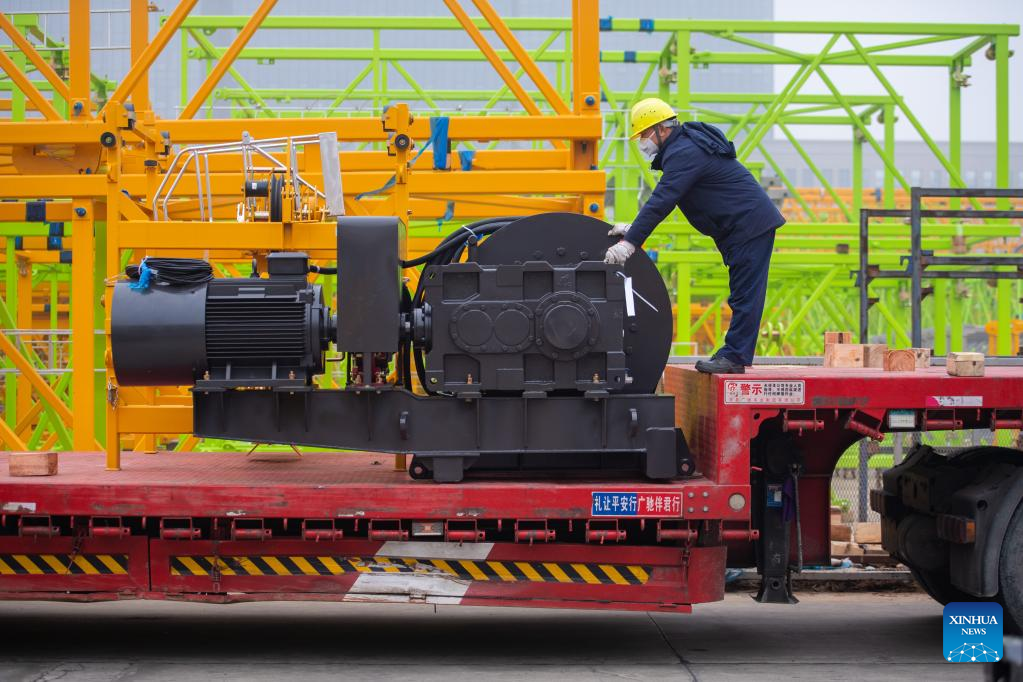 A staff member prepares for product delivery in Zoomlion Heavy Industry Science and Technology Co., Ltd. at the Changde National High-Tech Industrial Development Zone in Changde City, central China's Hunan Province, Jan. 13, 2023.