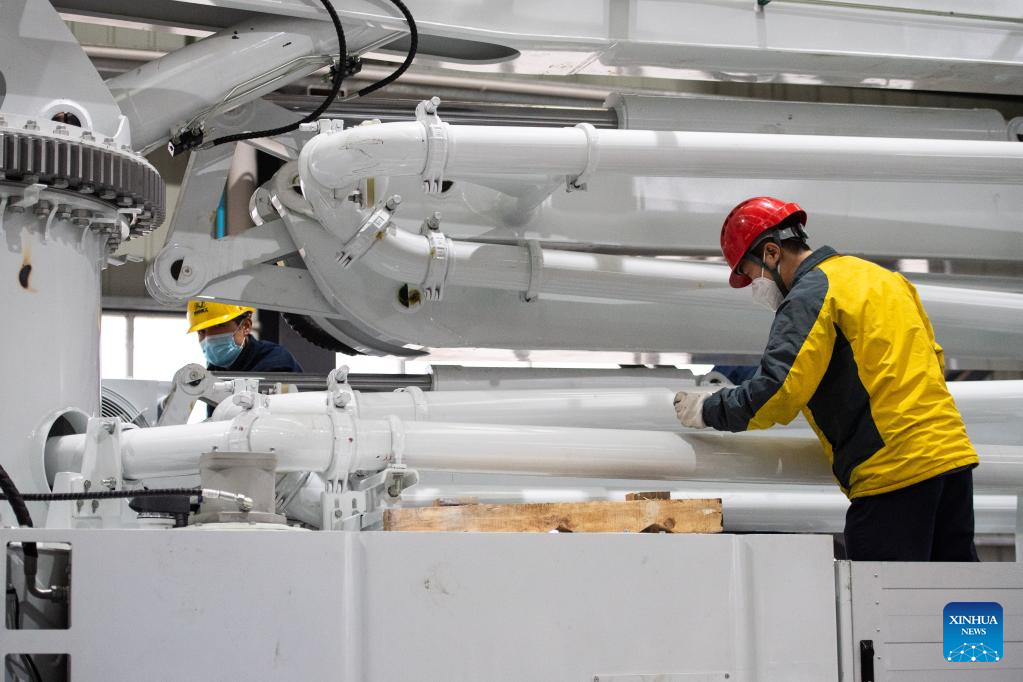 A staff member checks products in a workshop of Hunan Xanjer Heavy Industry Science and Technology Co., Ltd. at the Changde National High-Tech Industrial Development Zone in Changde City, central China's Hunan Province, Jan. 13, 2023.