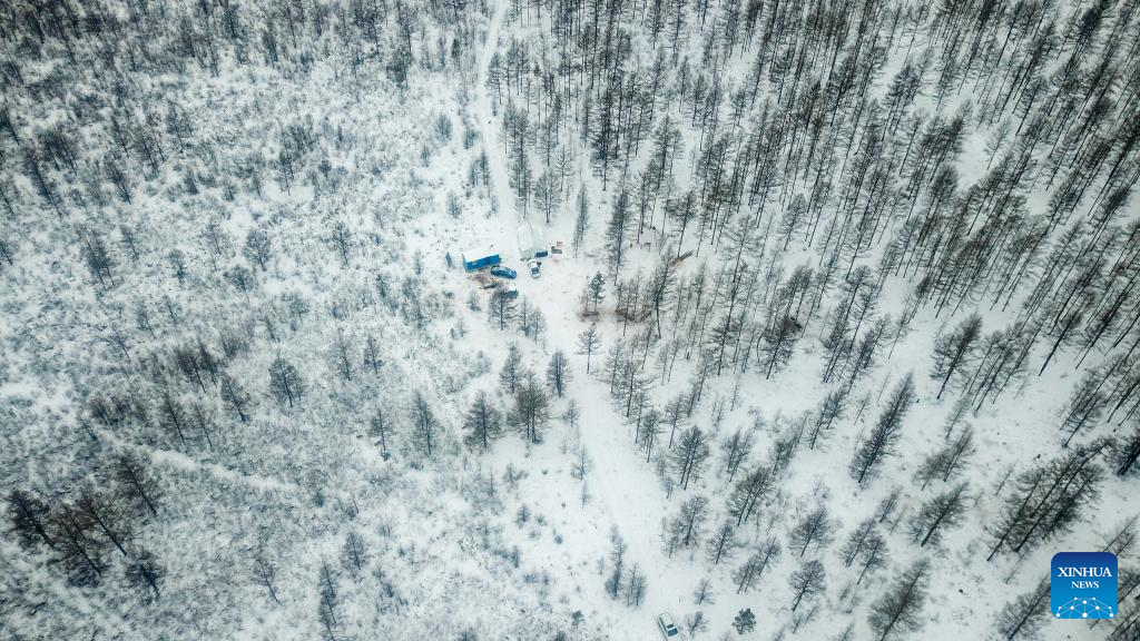 This aerial photo taken on Jan. 12, 2023 shows a temporary herding station deep in the Jinhe forest range near Genhe City, north China's Inner Mongolia Autonomous Region, Jan. 12, 2023.