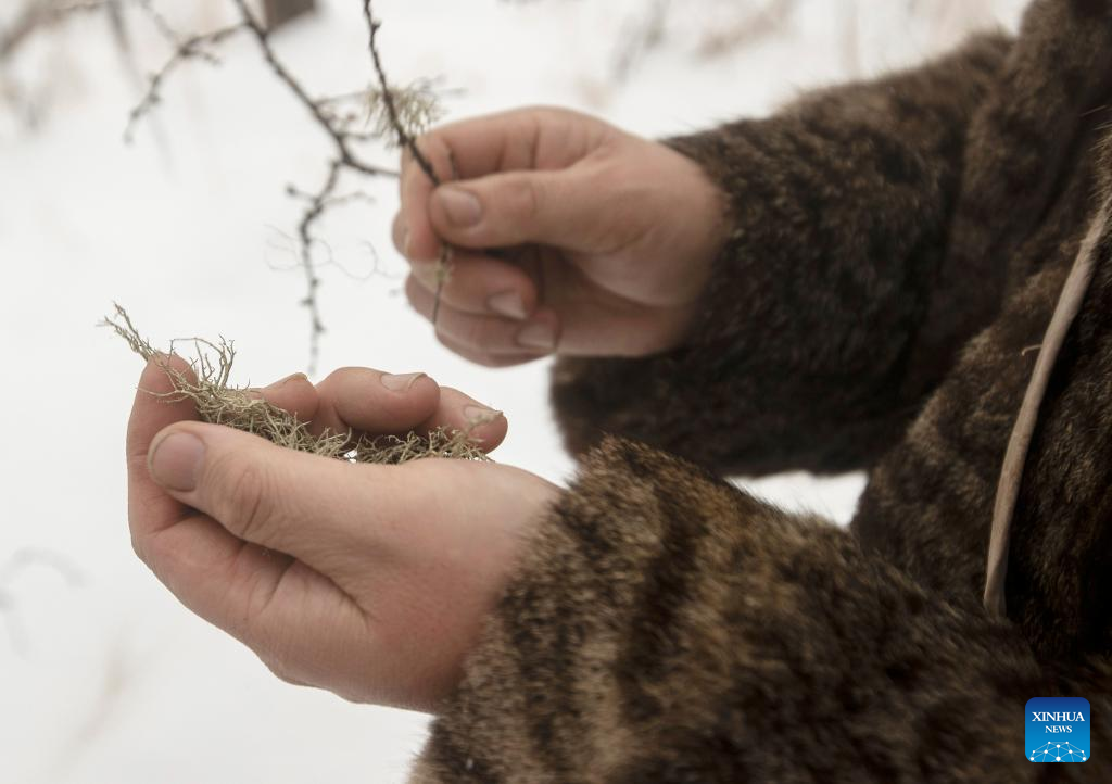 Juele checks a kind of moss growing on trees, one of the favorite foods of reindeer, at the Jinhe forest range near Genhe City, north China's Inner Mongolia Autonomous Region, Jan. 12, 2023.