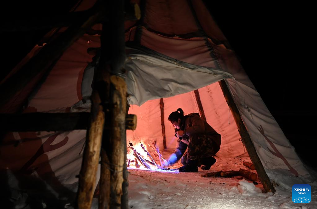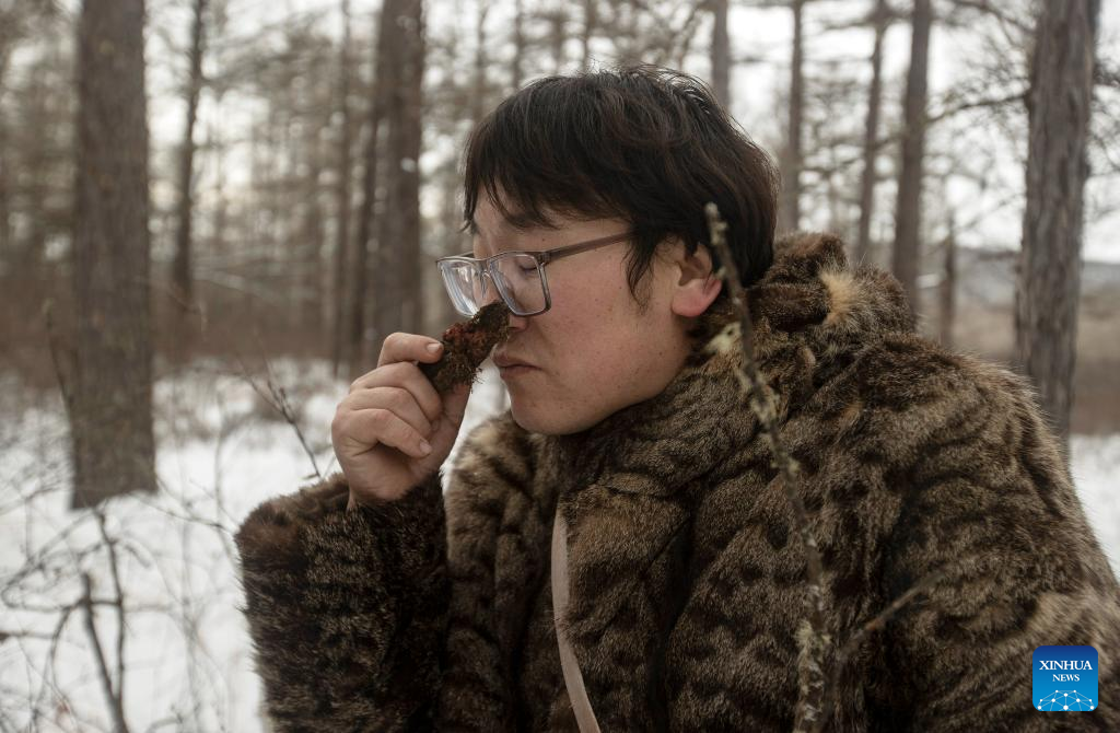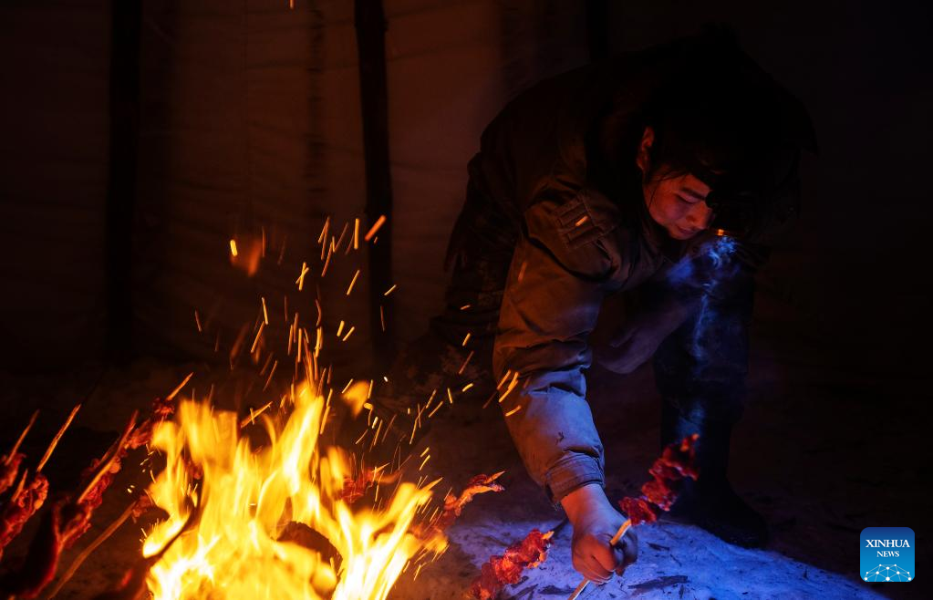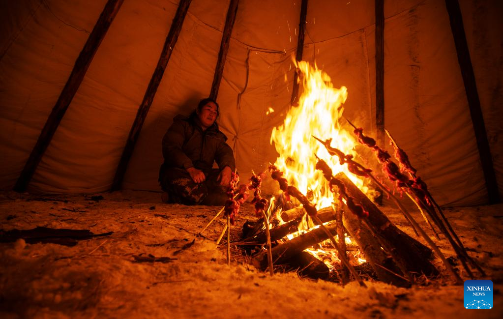 Dalinma, Juele's cousin, cooks kebabs in a traditional Ewenki tent at a temporary herding station at the Jinhe forest range near Genhe City, north China's Inner Mongolia Autonomous Region, Jan. 11, 2023.