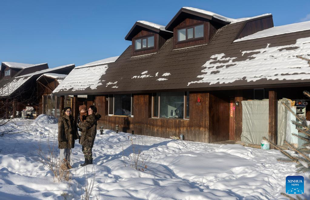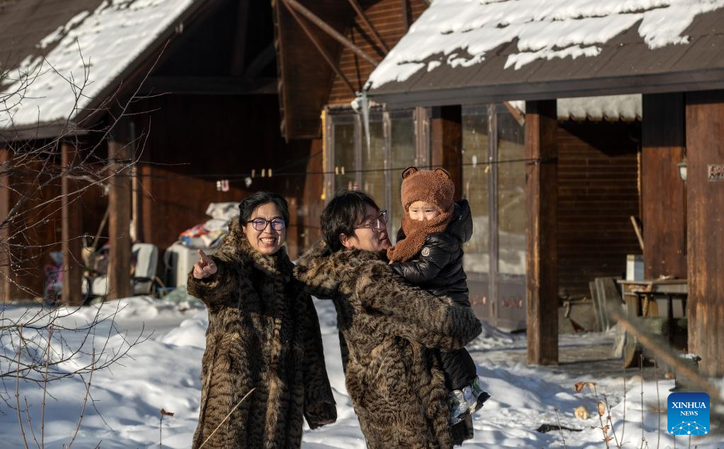 This photo taken on Jan. 13, 2023 shows Juele with his family at a new relocation community in Aoluguya Ewenki Township, Genhe City of north China's Inner Mongolia Autonomous Region.