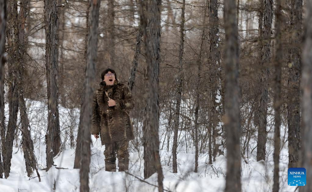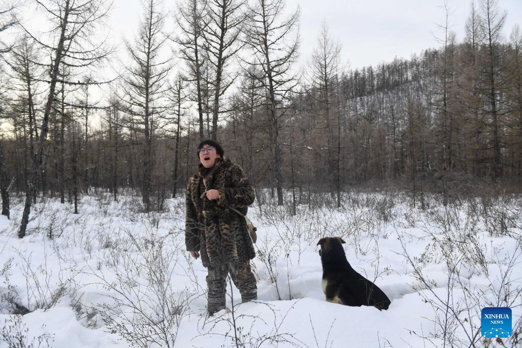 Juele calls his reindeer at the Jinhe forest range near Genhe City, north China's Inner Mongolia Autonomous Region, Jan. 12, 2023.