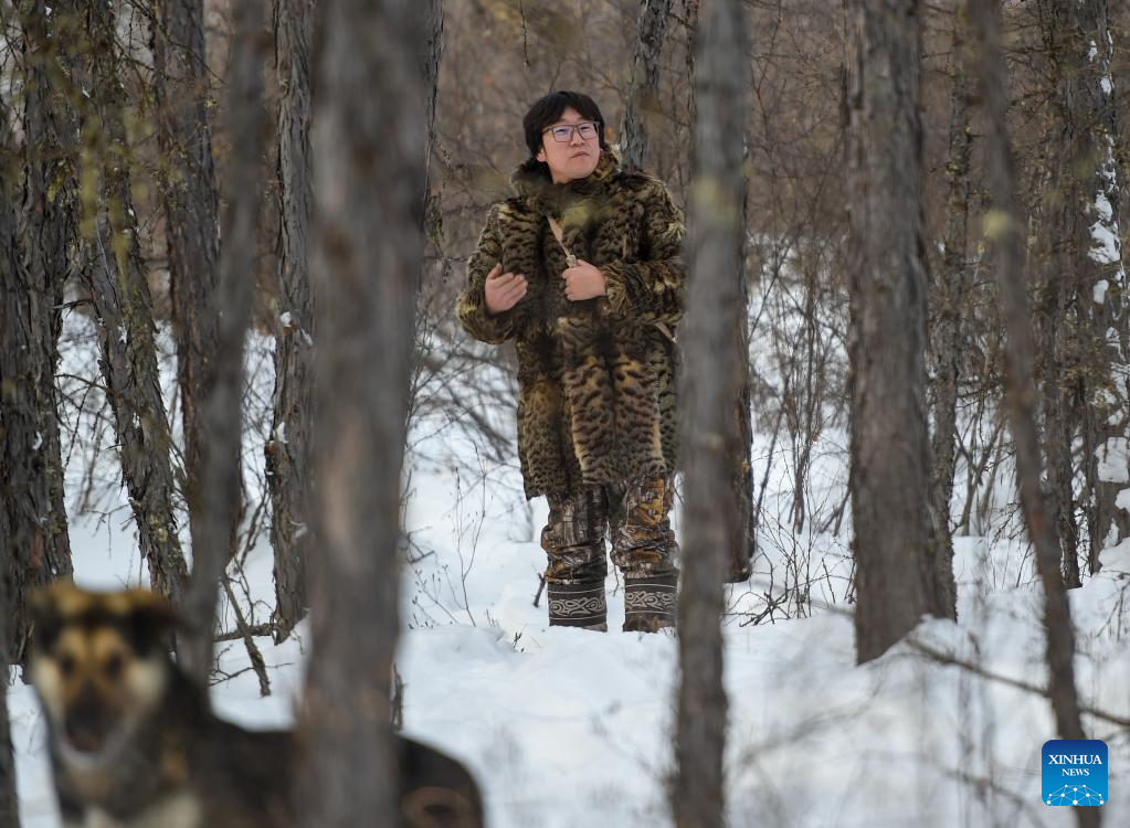 This photo taken on Jan. 12, 2023 shows Juele with his reindeer at the Jinhe forest range near Genhe City, north China's Inner Mongolia Autonomous Region.