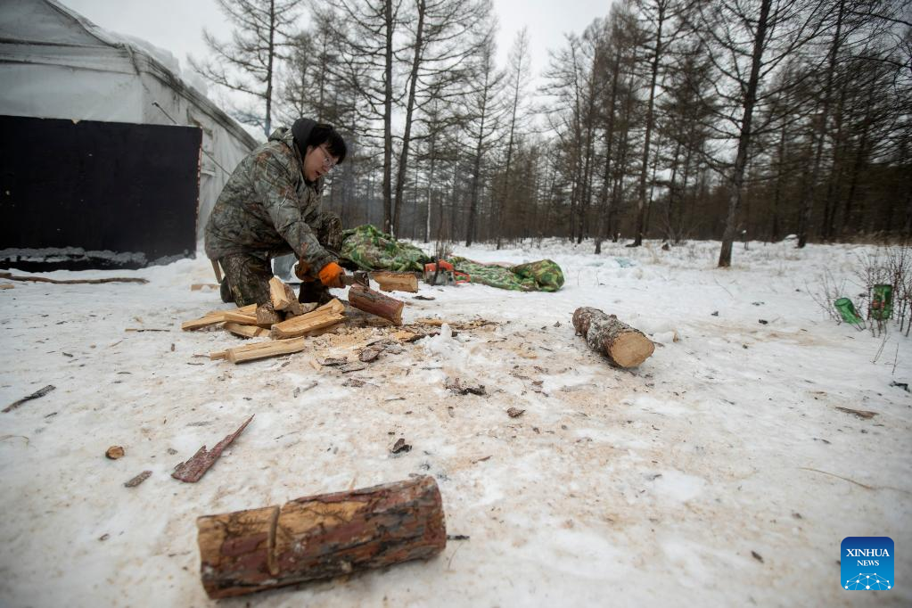 Juele chops up firewood at a temporary herding station at the Jinhe forest range near Genhe City, north China's Inner Mongolia Autonomous Region, Jan. 12, 2023.
