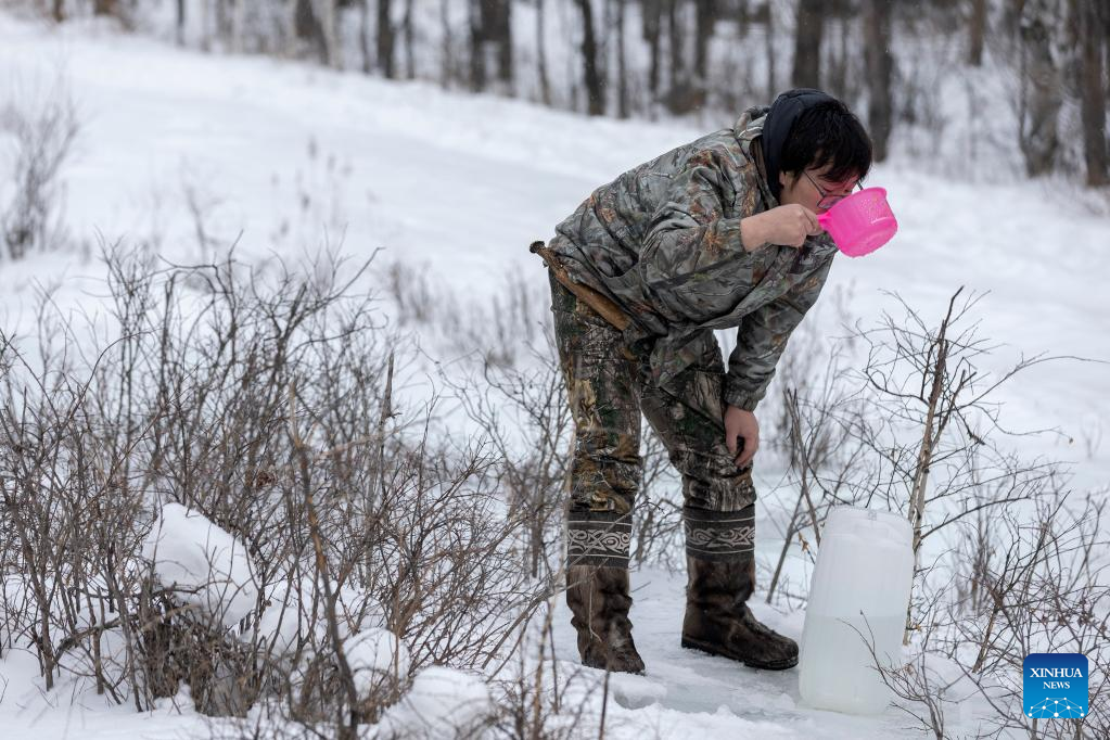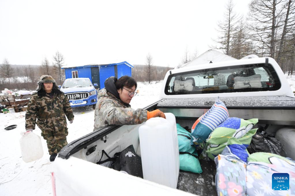 Juele and his cousin Dalinma prepare to get some water at a temporary herding station at the Jinhe forest range near Genhe City, north China's Inner Mongolia Autonomous Region, Jan. 12, 2023.
