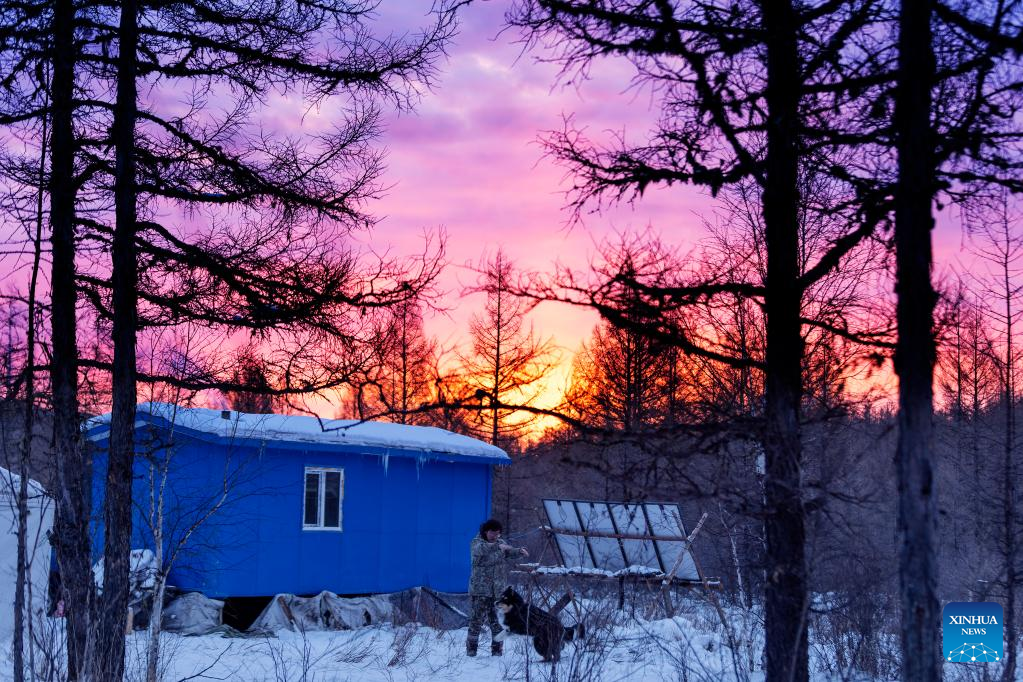 Juele calls his dogs in front of a mobile lodge, preparing to look for his reindeers, at the Jinhe forest range near Genhe City, north China's Inner Mongolia Autonomous Region, Jan. 12, 2023.