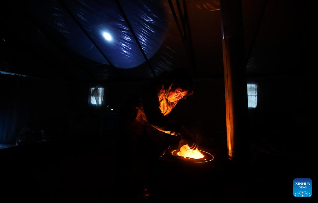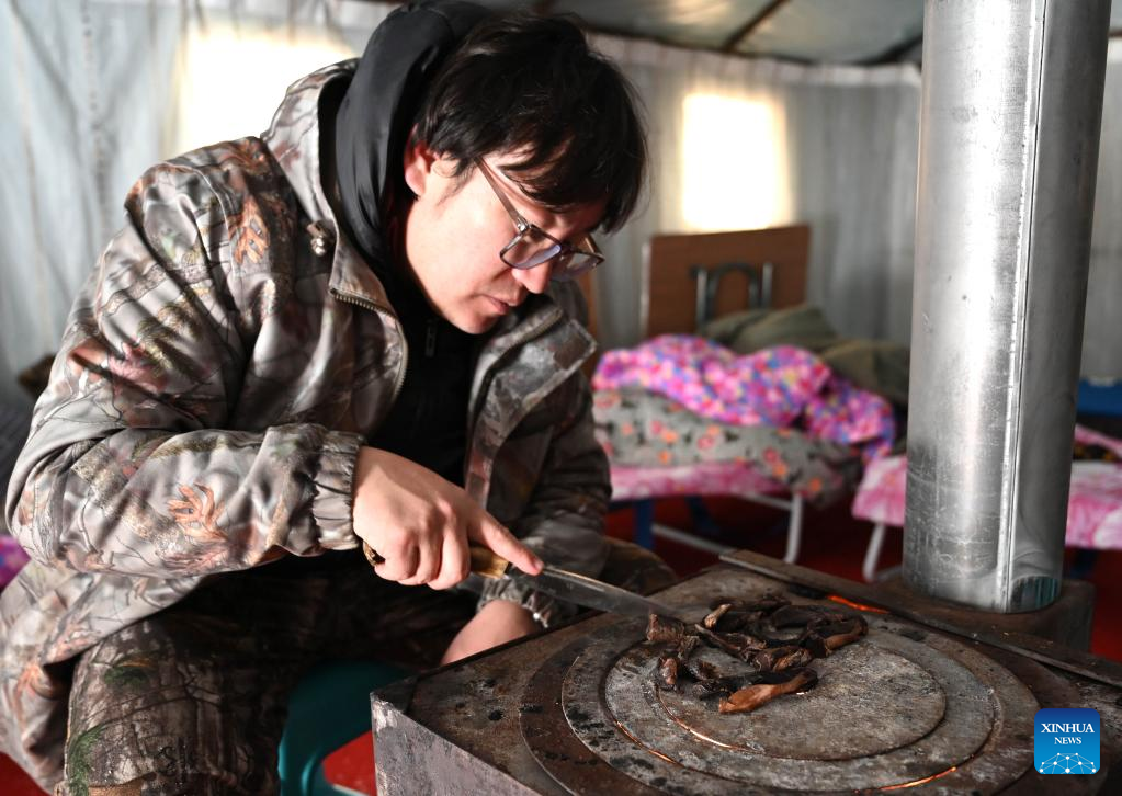 Juele bakes meat on a stove in a tent at a temporary herding station at the Jinhe forest range near Genhe City, north China's Inner Mongolia Autonomous Region, Jan. 12, 2023.