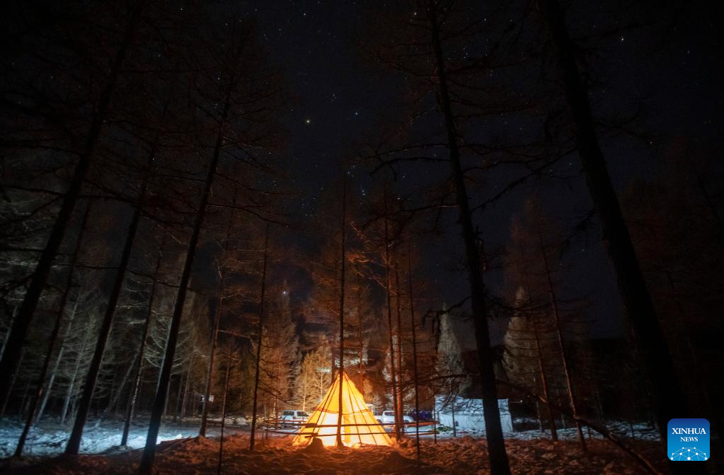 This photo taken on Jan. 11, 2023 shows a traditional Ewenki tent at a temporary herding station at the Jinhe forest range near Genhe City, north China's Inner Mongolia Autonomous Region.