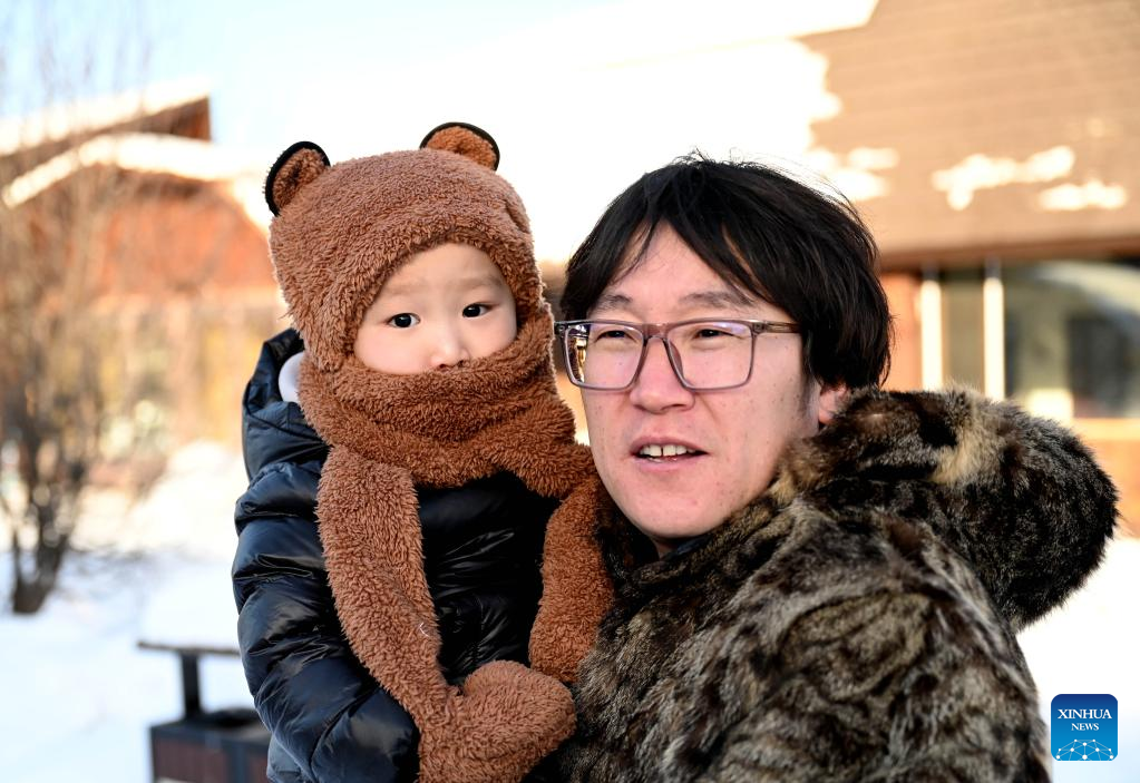This photo taken on Jan. 13, 2023 shows Juele with his kid at a new relocation community in Aoluguya Ewenki Township in Genhe City, north China's Inner Mongolia Autonomous Region.