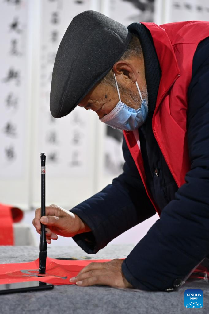 A villager writes Spring Festival couplets in Sidi Village, Wenxi County of Yuncheng City, north China's Shanxi Province, Jan. 13, 2023. Rich in couplet culture, the village of Sidi recently organized villagers to write Spring Festival couplets to welcome the upcoming Chinese Lunar New Year. (Xinhua/Yang Chenguang)