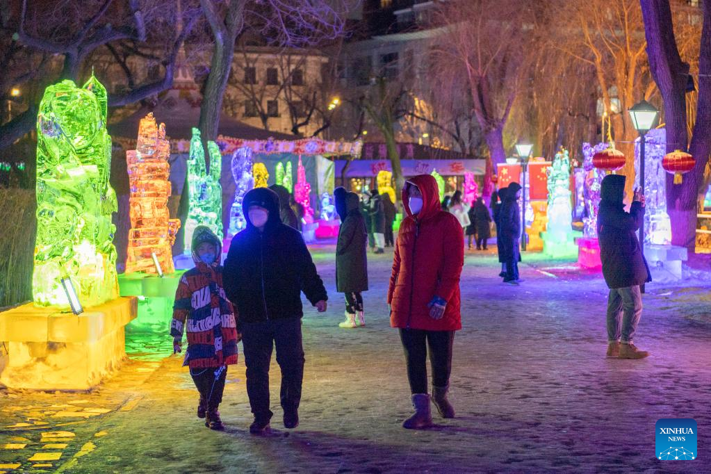 People visit an ice lantern fair in Harbin, northeast China's Heilongjiang Province, Jan. 14, 2023. Harbin is famous for its rich ice and snow resources. This winter, the city opened three ice and snow-themed parks, launched 12 ice and snow experience products and 10 such tourism routes, and created more than 100 related activities to promote the development of winter tourism, culture, fashion and sports. (Xinhua/Xie Jianfei)