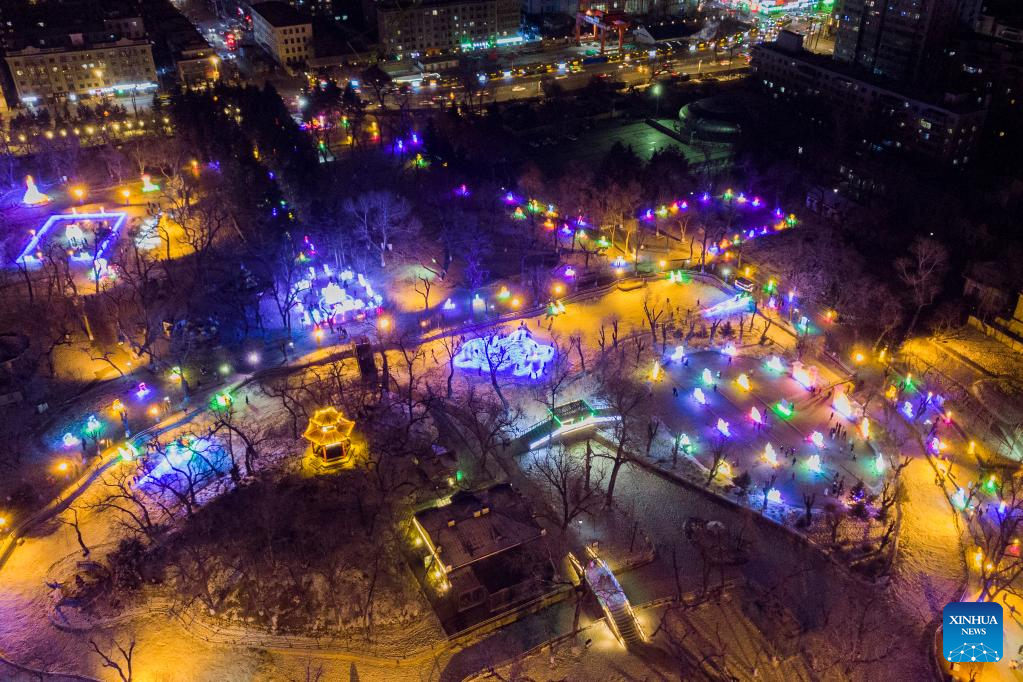 This aerial photo taken on Jan. 14, 2023 shows an ice lantern fair in Harbin, northeast China's Heilongjiang Province. Harbin is famous for its rich ice and snow resources. This winter, the city opened three ice and snow-themed parks, launched 12 ice and snow experience products and 10 such tourism routes, and created more than 100 related activities to promote the development of winter tourism, culture, fashion and sports. (Xinhua/Xie Jianfei)