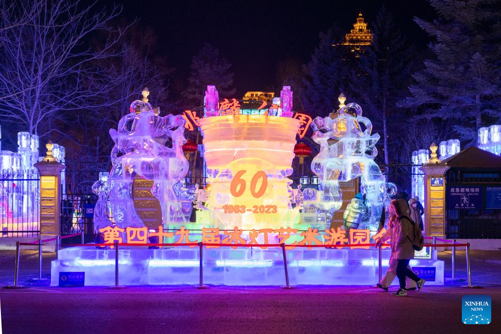 People pass the entrance of an ice lantern fair in Harbin, northeast China's Heilongjiang Province, Jan. 14, 2023. Harbin is famous for its rich ice and snow resources. This winter, the city opened three ice and snow-themed parks, launched 12 ice and snow experience products and 10 such tourism routes, and created more than 100 related activities to promote the development of winter tourism, culture, fashion and sports. (Xinhua/Xie Jianfei)