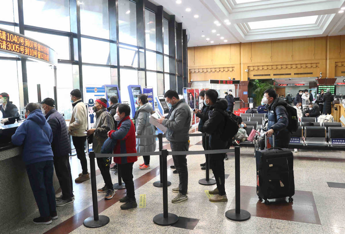 Aline of passport applicants forms at the Beijing Public Security Bureau immigration service hall on Jan 9. ZOU HONG/CHINA DAILY
