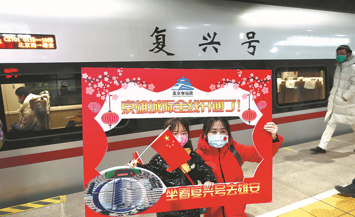 Passengers take a picture in front of a bullet train from Beijing to the Xiong'an New Area, Hebei province, in December 2020, when the line started operations. ZOU HONG/CHINA DAILY