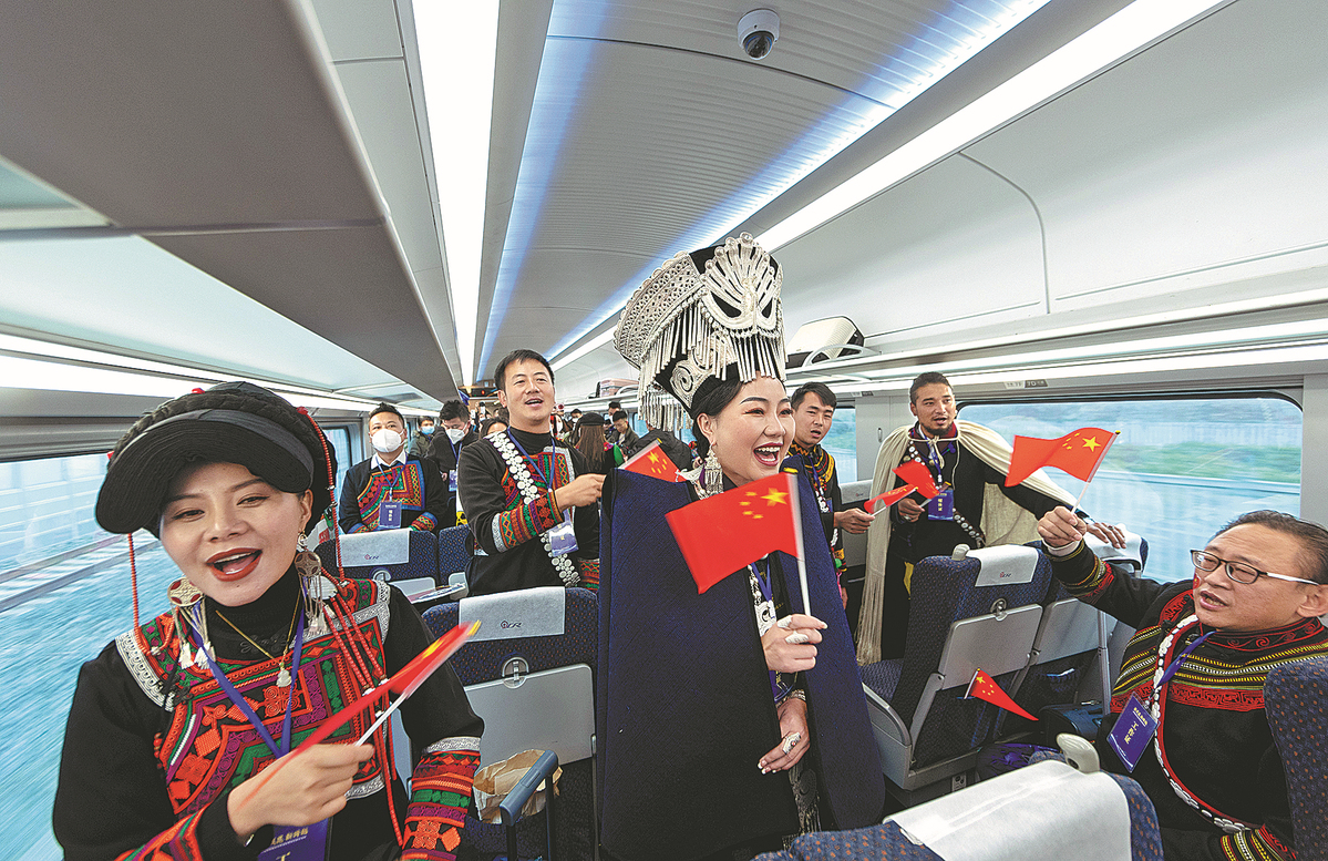 People from the Yi ethnic group sing during a train journey from Chengdu, Sichuan province, to Kunming, Yunnan province, last month. JIANG HONGJING/XINHUA