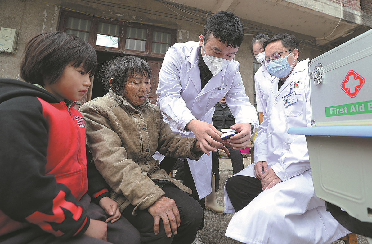A medical volunteer team, composed of a medical university professor and his postgraduate students, test a rural resident's blood oxygen saturation level in Chenzhou, Hunan province, last week. They also delivered health kit packages to those living in remote areas. [Photo by Cao Zhengping/For China Daily]