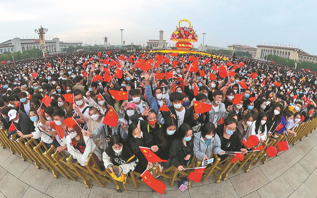 Visitors watch the national flag-raising ceremony in Tian'anmen Square in Beijing on the morning of Oct 1, 2022. ZHU XINGXIN/CHINA DAILY