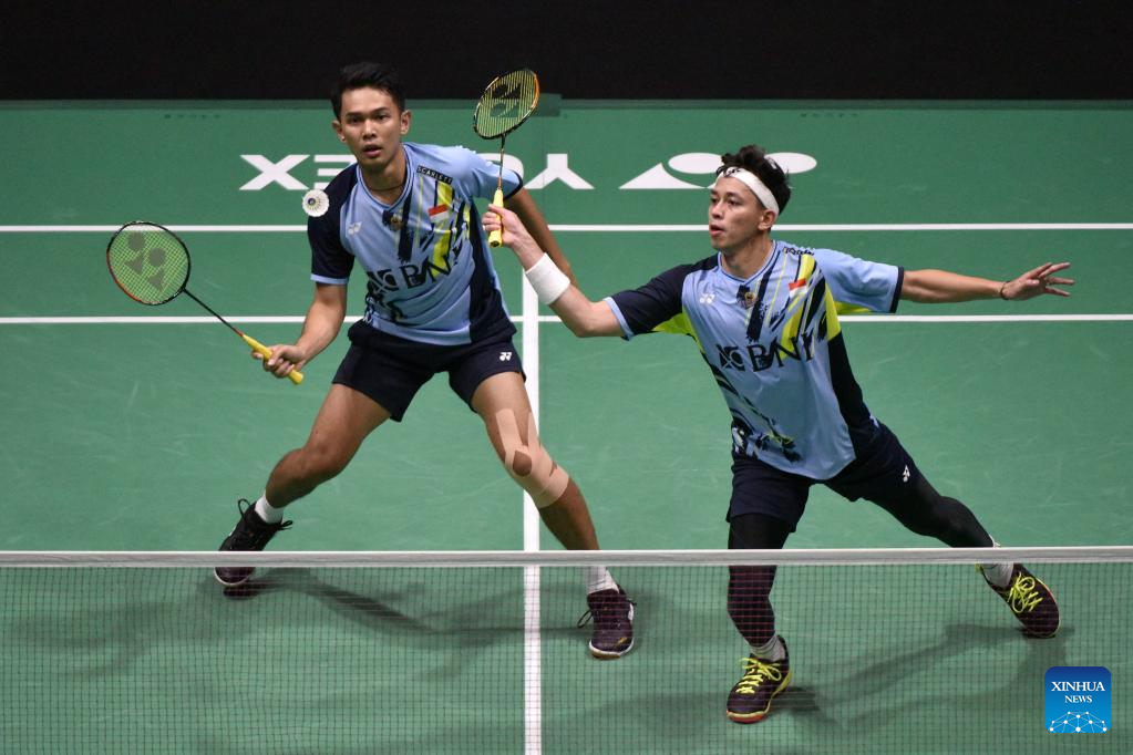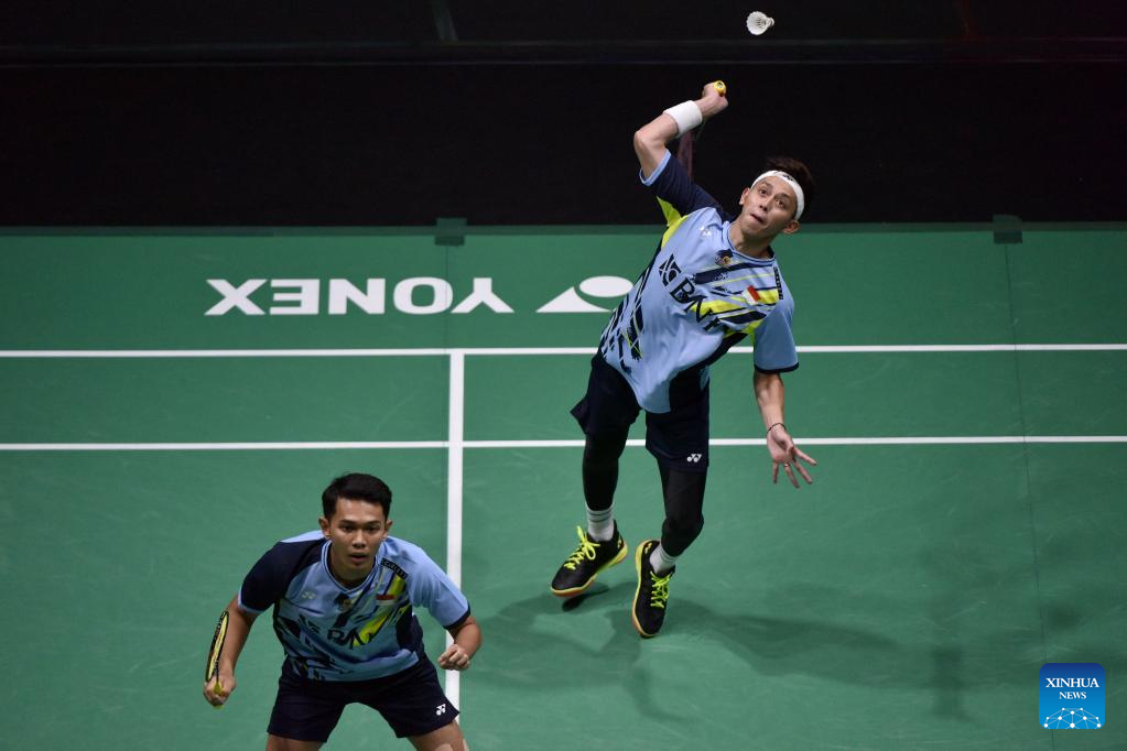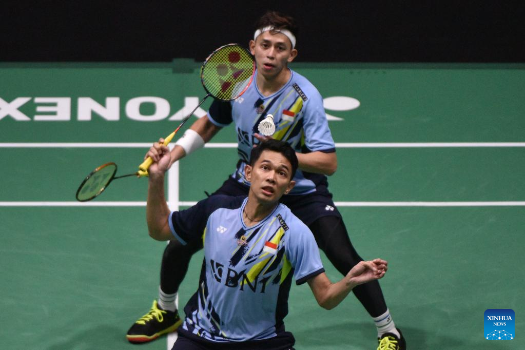 Indonesia's Fajar Alfian/Muhammad Rian Ardianto (R) compete during the men's doubles final match against China's Liang Weikeng/Wang Chang at Malaysia Open 2023 in Kuala Lumpur, Malaysia, Jan. 15, 2023. (Photo by Chong Voon Chung/Xinhua)