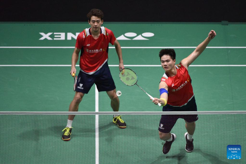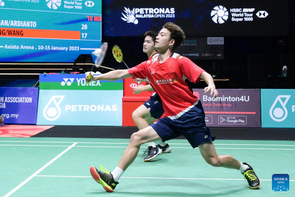 China's Liang Weikeng/Wang Chang (R) compete during the men's doubles final match against Indonesia's Fajar Alfian/ Muhammad Rian Ardianto at Malaysia Open 2023 in Kuala Lumpur, Malaysia, Jan. 15, 2023. (Xinhua/Zhu Wei)
