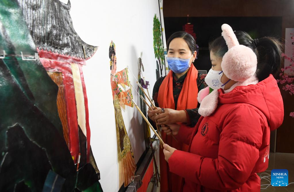 A girl experiences shadow puppetry inside the north division of Haidian culture center in Haidian District of Beijing, capital of China, Jan. 14, 2023. The Spring Festival culture season kicked off at the north division of Haidian culture center on Saturday, fulfilling the cultural needs of residents with various activities during the Spring Festival. (Xinhua/Ren Chao)