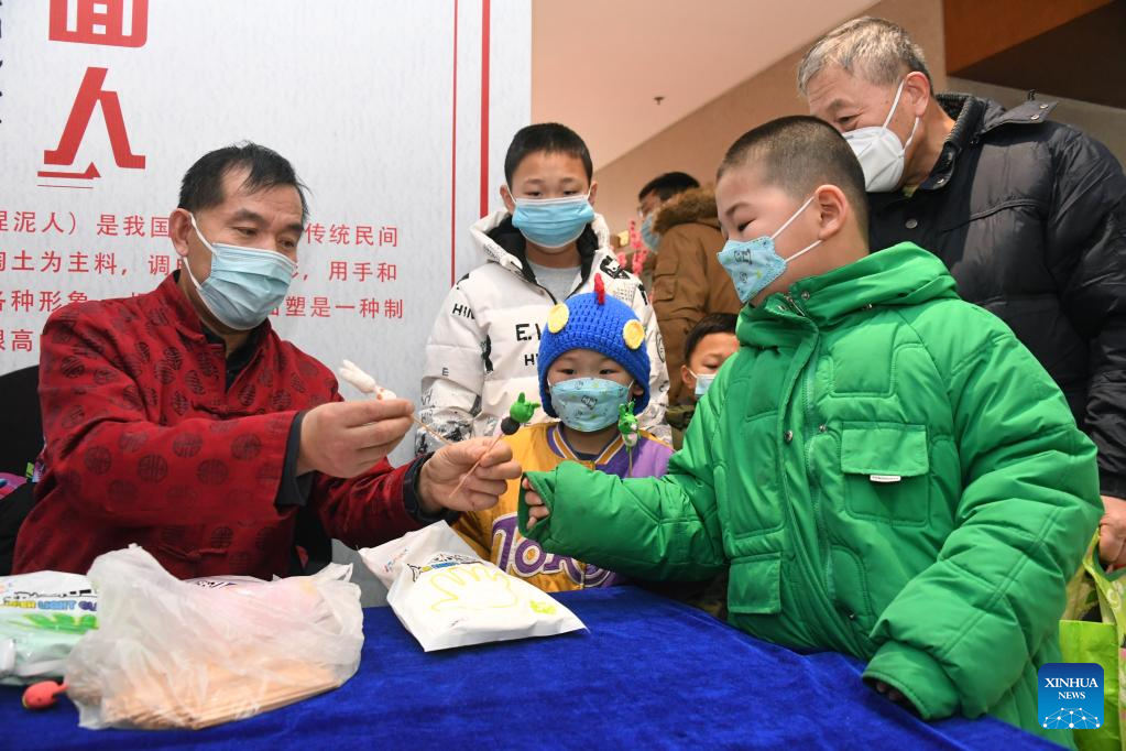 Children learn about traditional Chinese art of dough figurine inside the north division of Haidian culture center in Haidian District of Beijing, capital of China, Jan. 14, 2023. The Spring Festival culture season kicked off at the north division of Haidian culture center on Saturday, fulfilling the cultural needs of residents with various activities during the Spring Festival. (Xinhua/Ren Chao)
