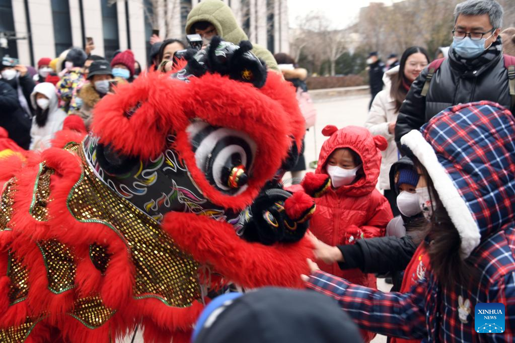 Children interact with lion dance performers outside the north division of Haidian culture center in Haidian District of Beijing, capital of China, Jan. 14, 2023. The Spring Festival culture season kicked off at the north division of Haidian culture center on Saturday, fulfilling the cultural needs of residents with various activities during the Spring Festival. (Xinhua/Ren Chao)
