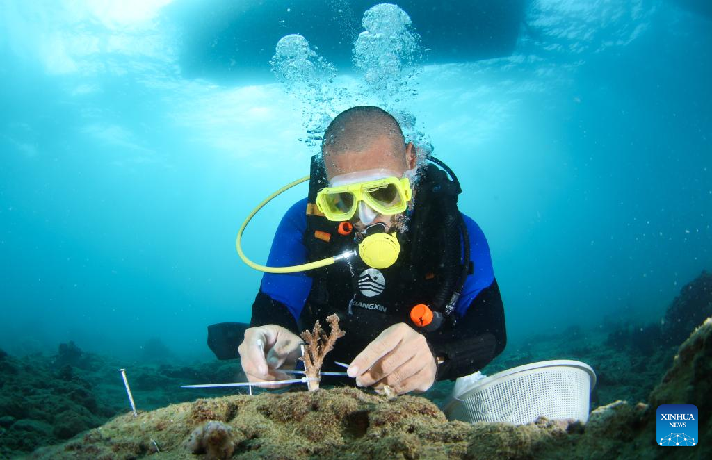 A diver transplants corals underwater in Yalong Bay, Sanya, south China's Hainan Province, Nov. 17, 2022. A coral reef ecosystem restoration project has been completed in waters of the Yalong Bay in Sanya. The work is done by means of placing artificial reefs and transplanting coral seedlings. Over 80 percent of the coral seedlings are expected to live for at least six months, while over 70 percent will survive for at least one year. (Xinhua/Yang Guanyu)