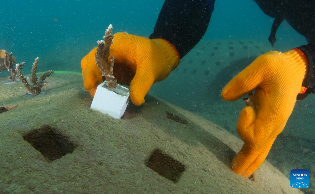 A diver transplants corals onto an artifical reef in Yalong Bay, Sanya, south China's Hainan Province, Nov. 16, 2022. A coral reef ecosystem restoration project has been completed in waters of the Yalong Bay in Sanya. The work is done by means of placing artificial reefs and transplanting coral seedlings. Over 80 percent of the coral seedlings are expected to live for at least six months, while over 70 percent will survive for at least one year. (Xinhua/Yang Guanyu)