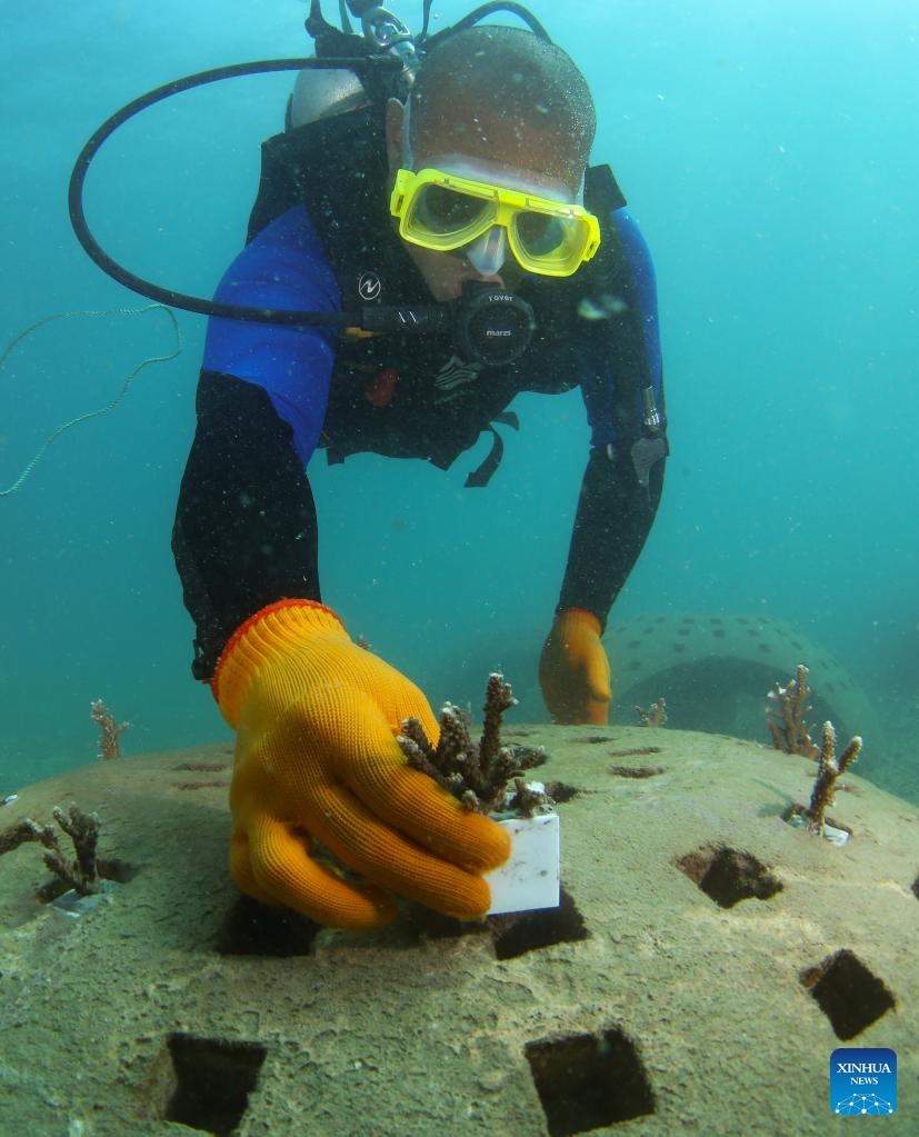 A diver transplants corals onto an artifical reef in Yalong Bay, Sanya, south China's Hainan Province, Nov. 16, 2022. A coral reef ecosystem restoration project has been completed in waters of the Yalong Bay in Sanya. The work is done by means of placing artificial reefs and transplanting coral seedlings. Over 80 percent of the coral seedlings are expected to live for at least six months, while over 70 percent will survive for at least one year. (Xinhua/Yang Guanyu)