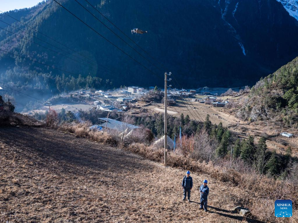 Wangden (L) and his colleague Zhang Jincheng use a drone to inspect power transmission lines in Deqen County, southwest China's Yunnan Province, Jan. 10, 2023.