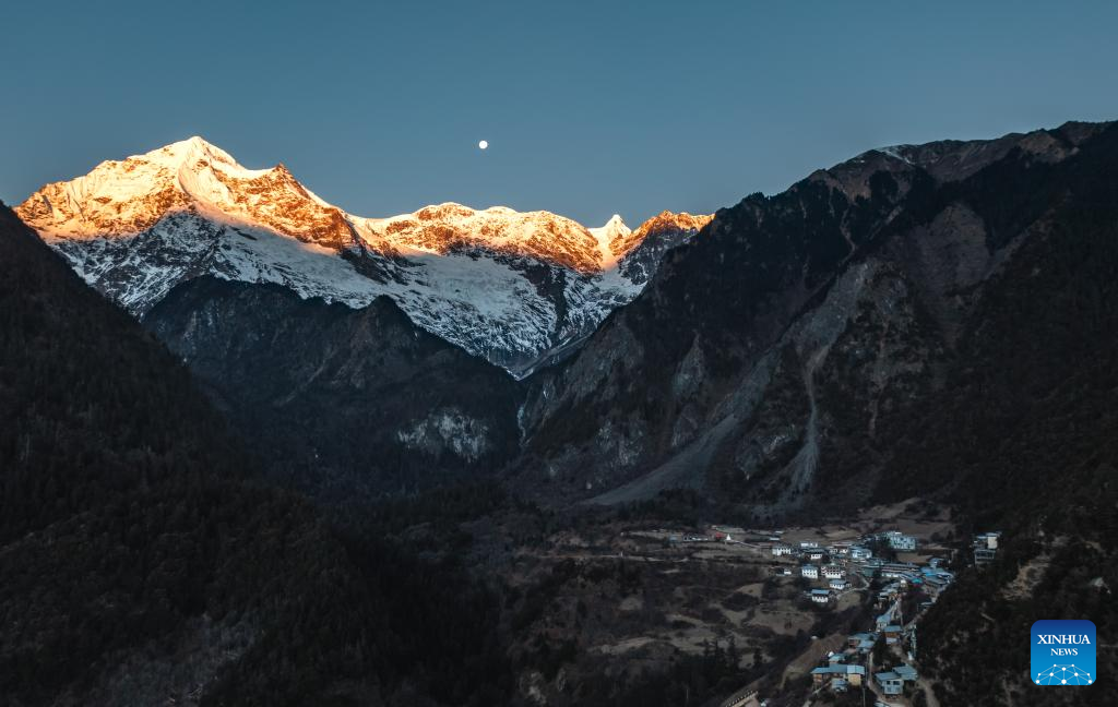 This aerial photo taken in Yubeng Village of Deqen County, southwest China's Yunnan Province shows sunlight shining on the Meili Snow Mountain on Jan. 9, 2023.