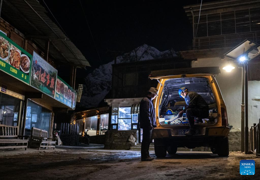 Wangden prepares equipment before inspecting power lines in Yubeng Village of Deqen County, southwest China's Yunnan Province, Jan. 8, 2023.