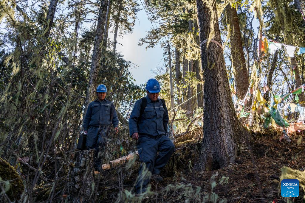 Wangden (L) and his colleague Zhang Jincheng inspect power transmission lines on a mountain in Deqen County, southwest China's Yunnan Province, Jan. 9, 2023.
