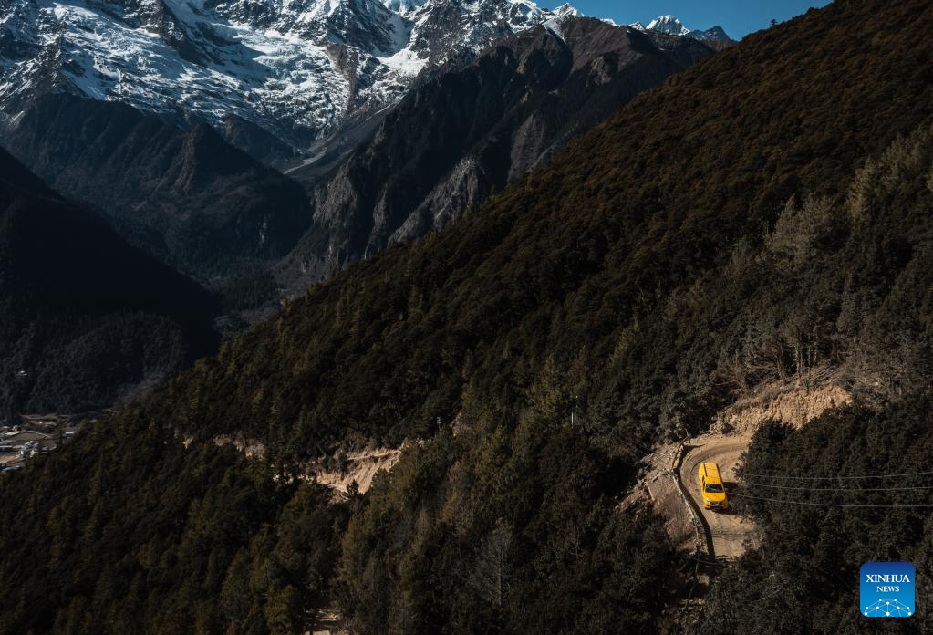 This aerial photo taken on Jan. 9, 2023 shows Wangden driving to Yubeng Village to inspect power transmission lines in Deqen County, southwest China's Yunnan Province.