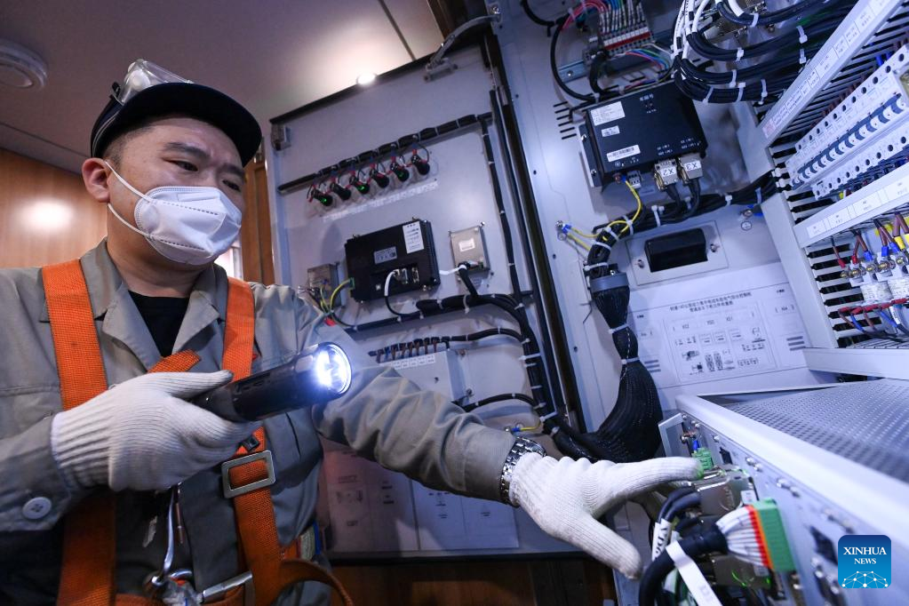 A technician inspects electricity at a bullet train maintenance center in Urumqi, northwest China's Xinjiang Uygur Autonomous Region, Jan. 14, 2023. Technicians at a high-speed train maintenance center in Urumqi have been busy carrying out maintenance work for trains during the Spring Festival travel rush. The Spring Festival travel rush, also known as "chunyun," began on Jan. 7 and will last until Feb. 15 this year, during which many Chinese people will travel to reunite with their families for the Chinese Lunar New Year, which falls on Jan. 22 this year. (Xinhua/Ding Lei)