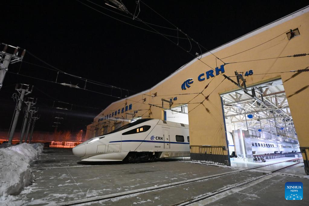 A bullet train pulls out of a maintenance center in Urumqi, northwest China's Xinjiang Uygur Autonomous Region, Jan. 14, 2023. Technicians at a high-speed train maintenance center in Urumqi have been busy carrying out maintenance work for trains during the Spring Festival travel rush. The Spring Festival travel rush, also known as "chunyun," began on Jan. 7 and will last until Feb. 15 this year, during which many Chinese people will travel to reunite with their families for the Chinese Lunar New Year, which falls on Jan. 22 this year. (Xinhua/Ding Lei)