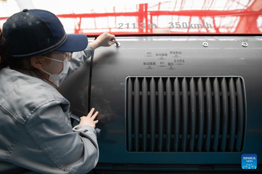 A staff member tests equipment on the Fuxing Electric Multiple Unit (EMU) CR400BF-GZ at a maintenance station of China Railway Harbin Bureau Group Co., Ltd. in northeast China's Heilongjiang Province, Jan. 16, 2023. The most frost-resistant and most intelligent member of China's Fuxing bullet train family, the Fuxing EMU CR400BF-GZ, settled on Monday in northeast China's Heilongjiang Province. This is the region of the highest latitude and the lowest temperature that the EMU, with an operating speed of 350 km per hour, has ever reached by far. (Xinhua/Zhang Tao)