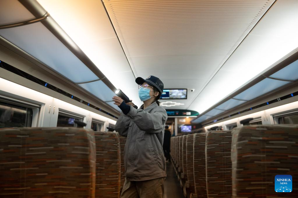 A staff member checks on the Fuxing Electric Multiple Unit (EMU) CR400BF-GZ at a maintenance station of China Railway Harbin Bureau Group Co., Ltd. in northeast China's Heilongjiang Province, Jan. 16, 2023. The most frost-resistant and most intelligent member of China's Fuxing bullet train family, the Fuxing EMU CR400BF-GZ, settled on Monday in northeast China's Heilongjiang Province. This is the region of the highest latitude and the lowest temperature that the EMU, with an operating speed of 350 km per hour, has ever reached by far. (Xinhua/Zhang Tao)