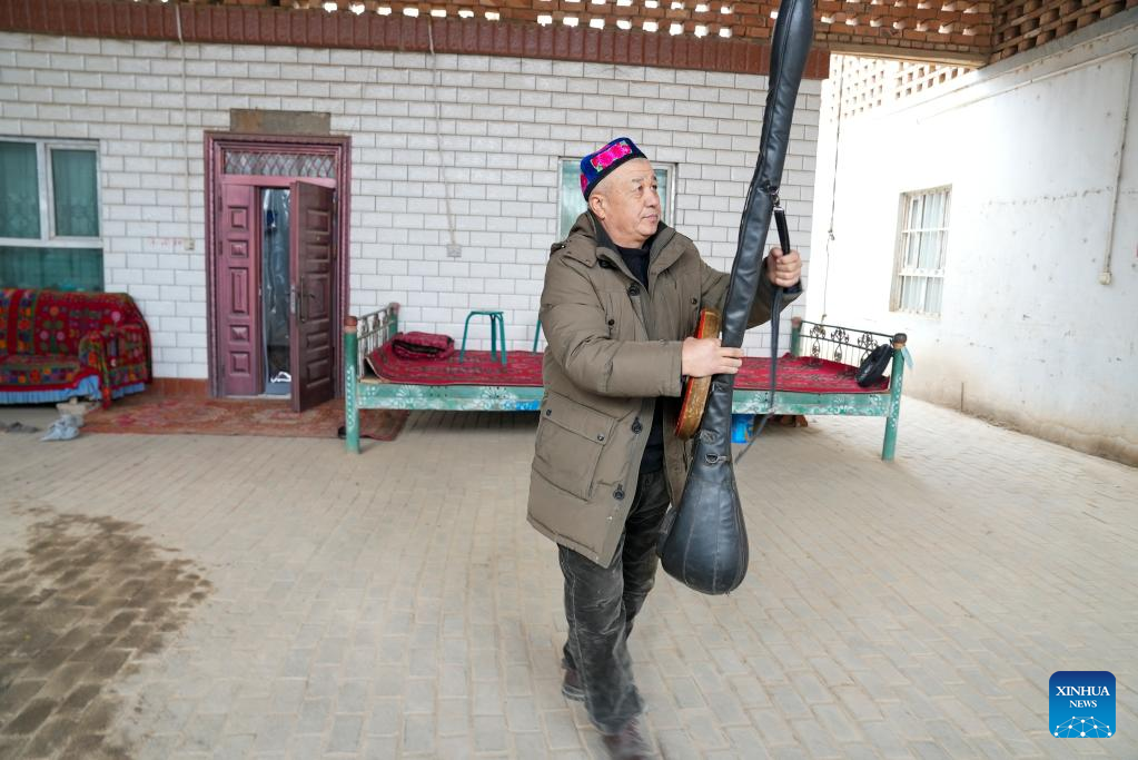 Sulayman Abdu prepares for a performance at his residence in Muqam Village, Lukqun Town, Shanshan County, northwest China's Xinjiang Uygur Autonomous Region, Jan. 11, 2023. With all grape vines buried properly for their protection against cold in winter, people of Lukqun Town in Shanshan have concluded their farm work of the year and started to enjoy a leisure time. However, Sulayman Abdu, a resident of Muqam Village in Lukqun, still has his hands full with performance appointments from his neighbors. Sulayman Abdu, 61, has been studying and practicing Muqam since he was 16, and now has become an inheritor of this popular folk art. Muqam, a traditional art of the Uygur ethnic group in Xinjiang, combines songs, dances, folk and classical music. According to Sulayman Abdu, it has been an age-long custom for local people to watch Muqam performance on occasions of celebration and gathering. (Xinhua/Zhao Ge)
