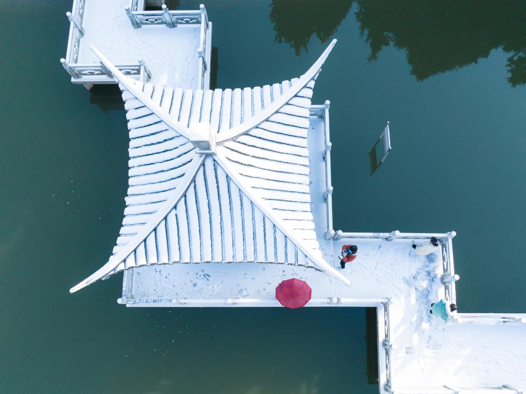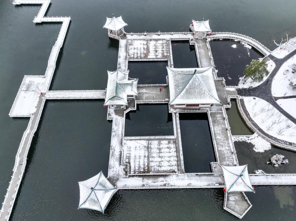 This aerial photo taken on Jan. 15, 2023 shows the snow scenery of Meiyuan garden in Suqian, east China's Jiangsu Province. (Photo by Xu Changliang/Xinhua)