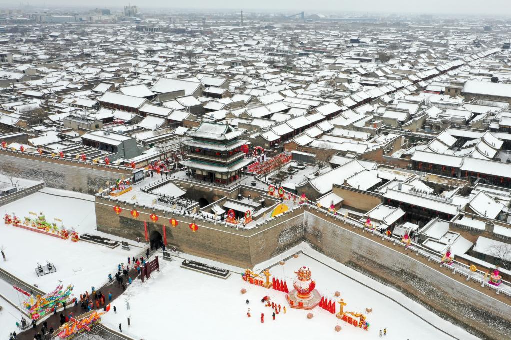 This aerial photo taken on Jan. 14, 2023 shows the snow scenery of Pingyao Ancient Town in Jinzhong City, north China's Shanxi Province. (Photo by Liang Shengren/Xinhua)