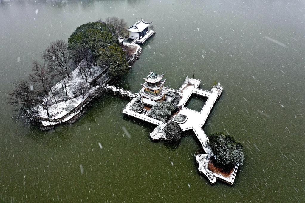 This aerial photo taken on Jan. 15, 2023 shows the snow scenery of the Geyuan Garden in Yangzhou, east China's Jiangsu Province. (Photo by Meng Delong/Xinhua)