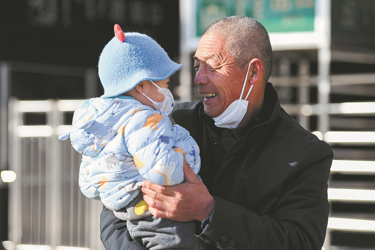 A man hugs his grandson at a railway station in Hohhot, Inner Mongolia autonomous region, on Sunday. LIU LEI/XINHUA