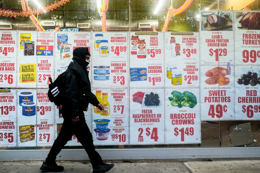 A pedestrian walks past a grocery store window showing advertisements in Queens, New York, the United States on Dec. 23, 2022. (Photo by Ziyu Julian Zhu/Xinhua)