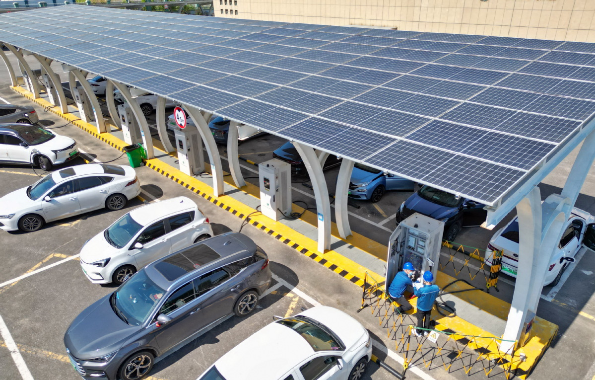 Technicians inspect facilities at a charging station in Yantai, Shandong province, in September. [Photo by TANG KE/FOR CHINA DAILY]