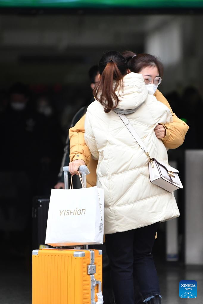 A woman hugs her daughter at the exit of Hohhot East Railway Station in Hohhot, north China's Inner Mongolia Autonomous Region, Jan. 15, 2023. China's Spring Festival travel rush kicked off on Jan. 7 this year and Chinese people are on their way to have a reunion with their loved ones. (Xinhua/Liu Lei)